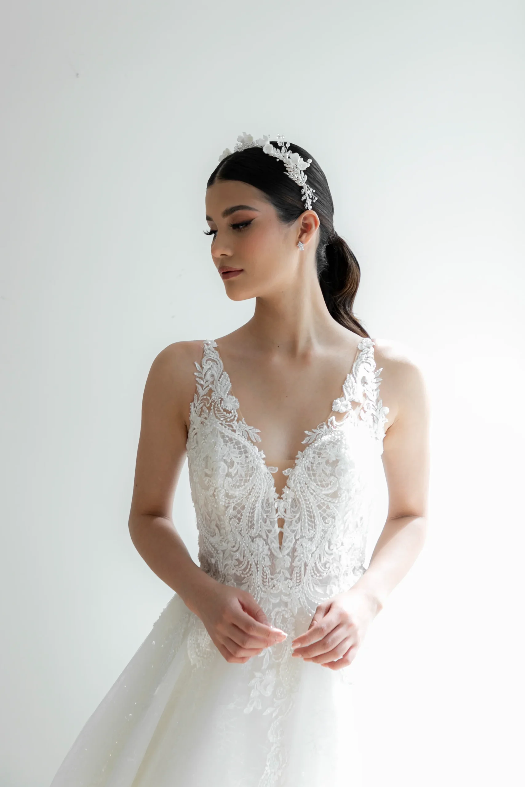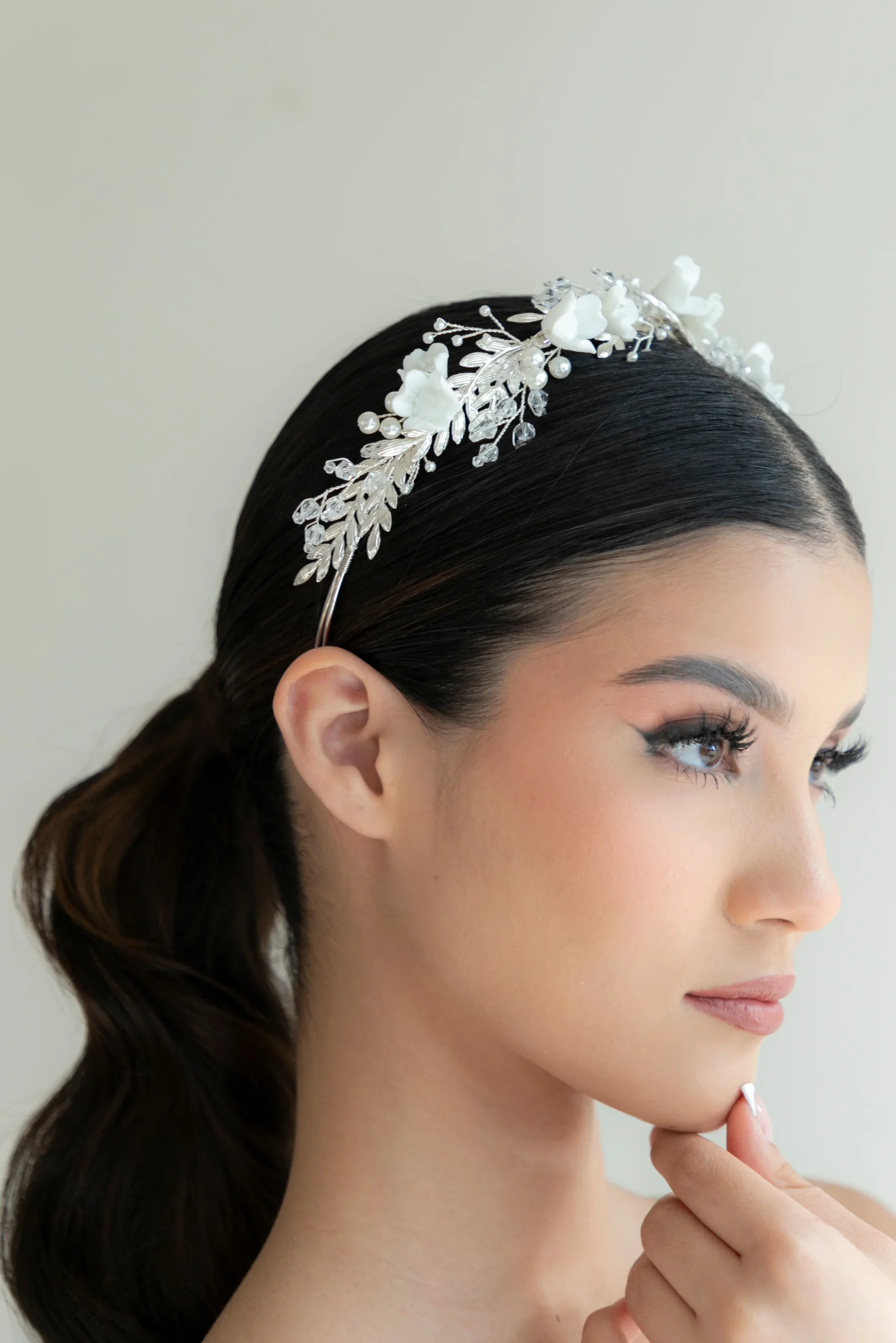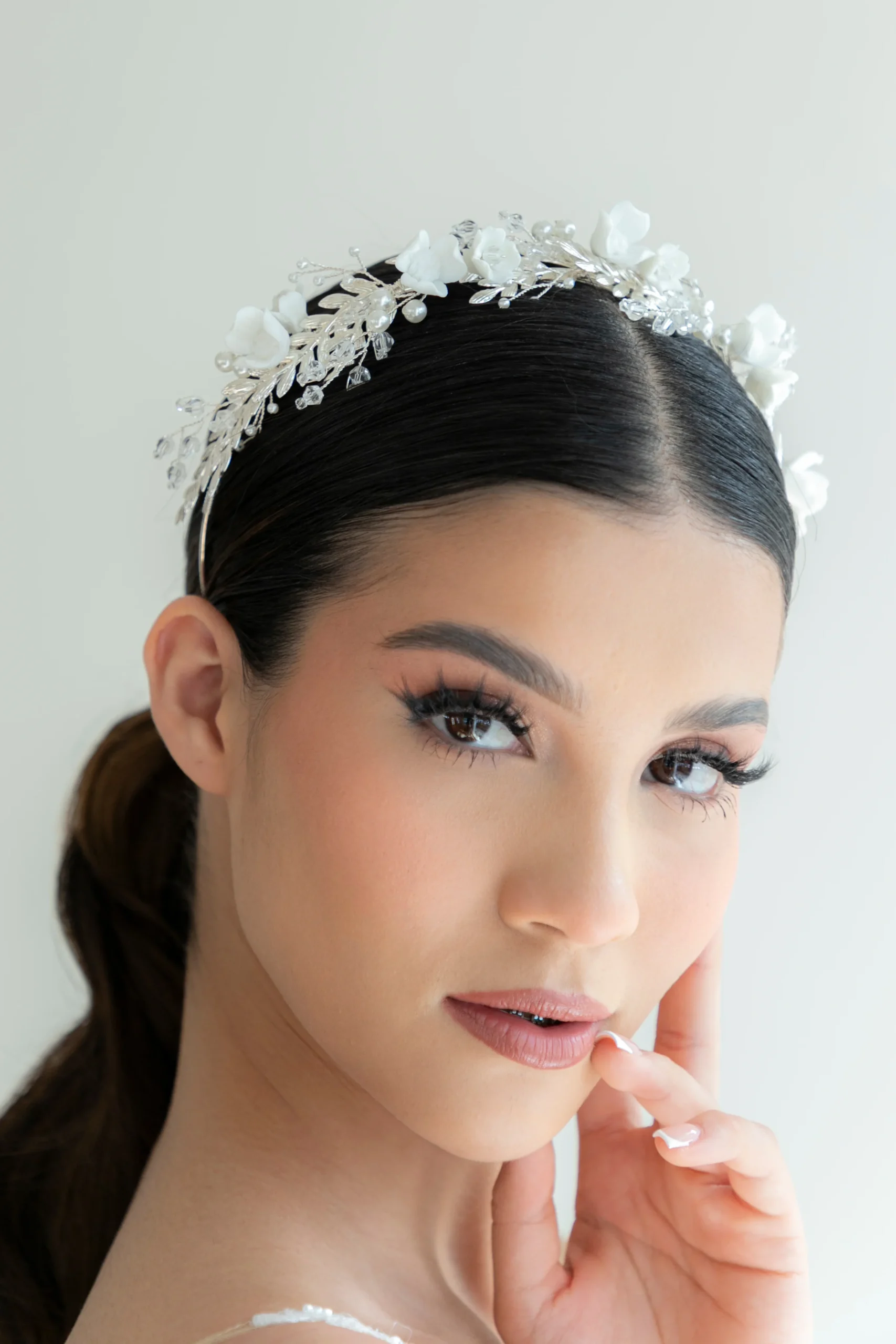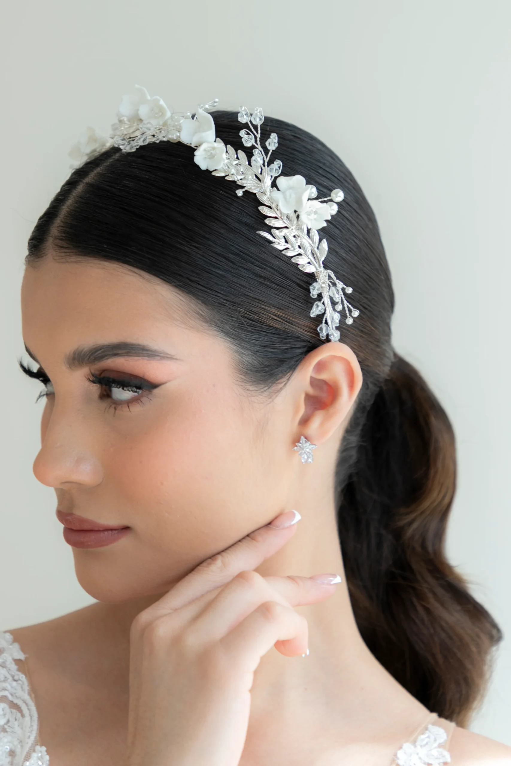 La G4632 es una guía flexible con un exquisito detalle. Está diseñada con flores en pasta, hojas con acabados en plata, combinando cristal facetado y cristal terminación perla en base de aleación de metales en chapa de plata.