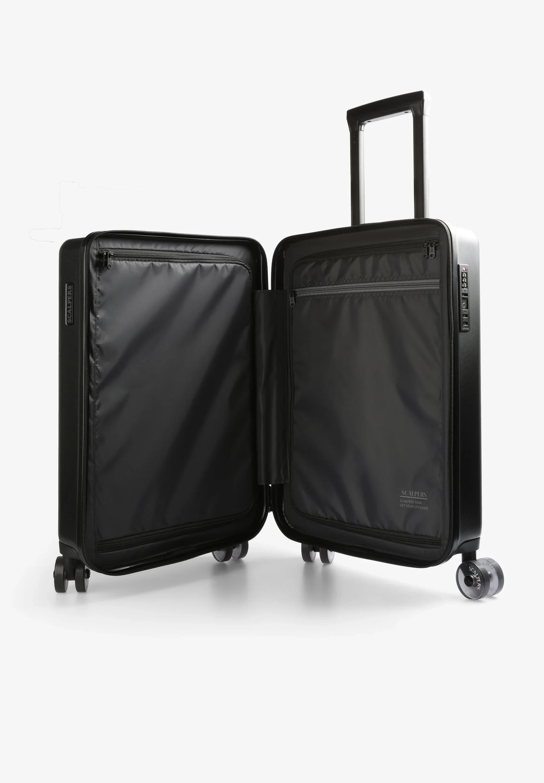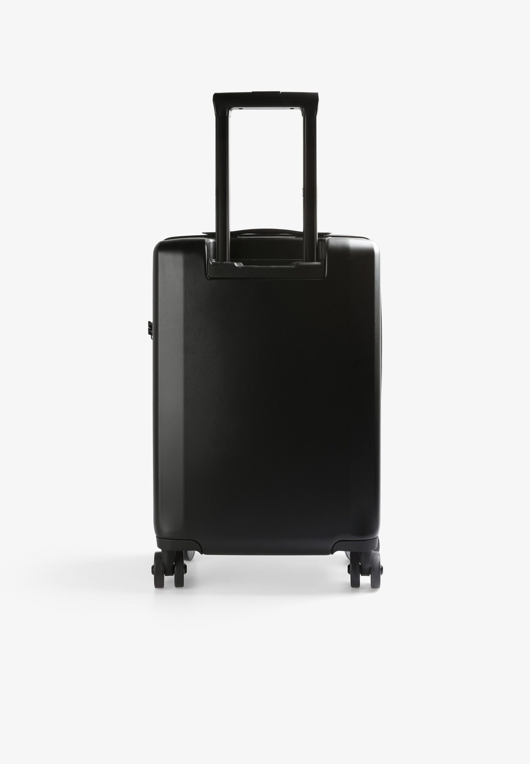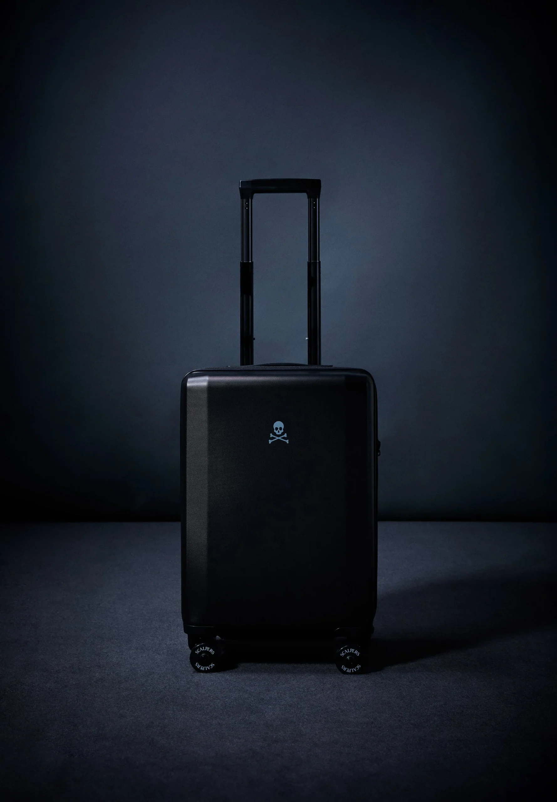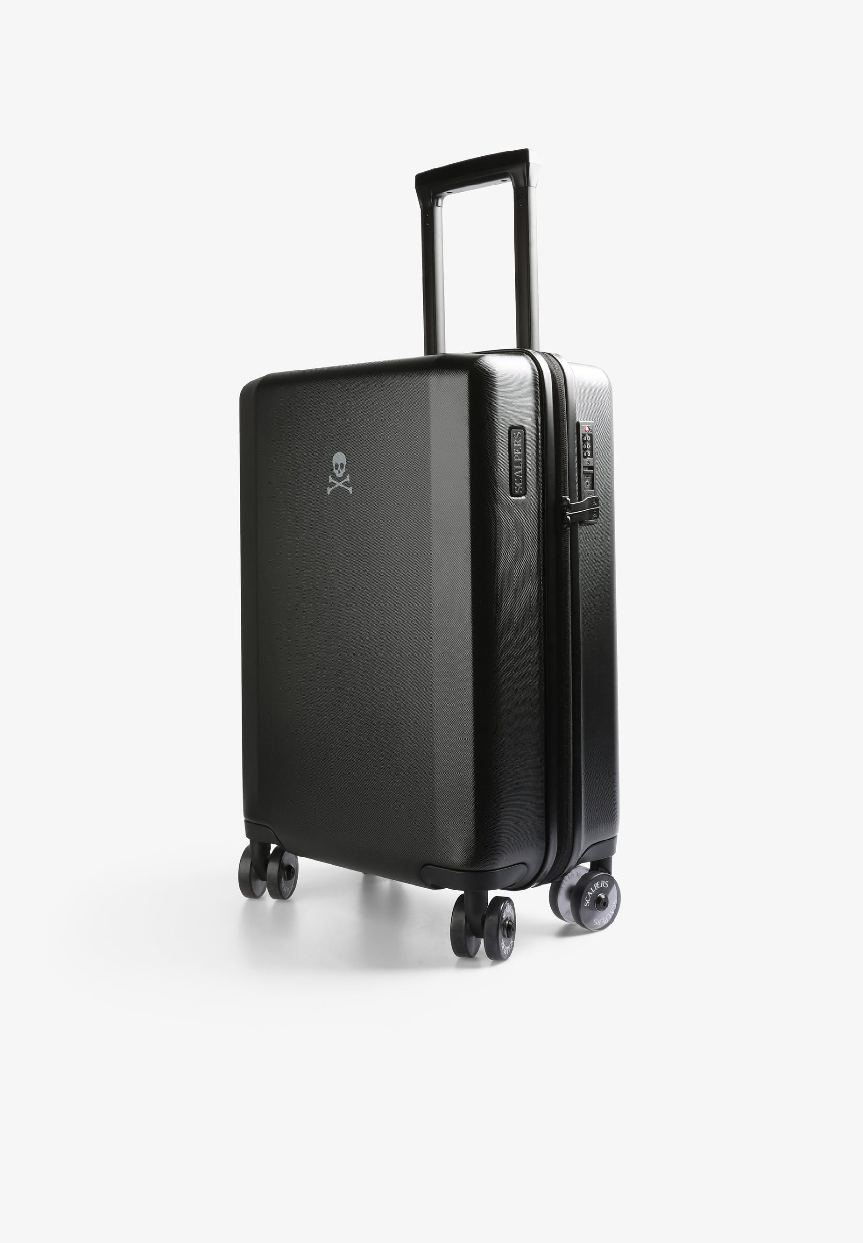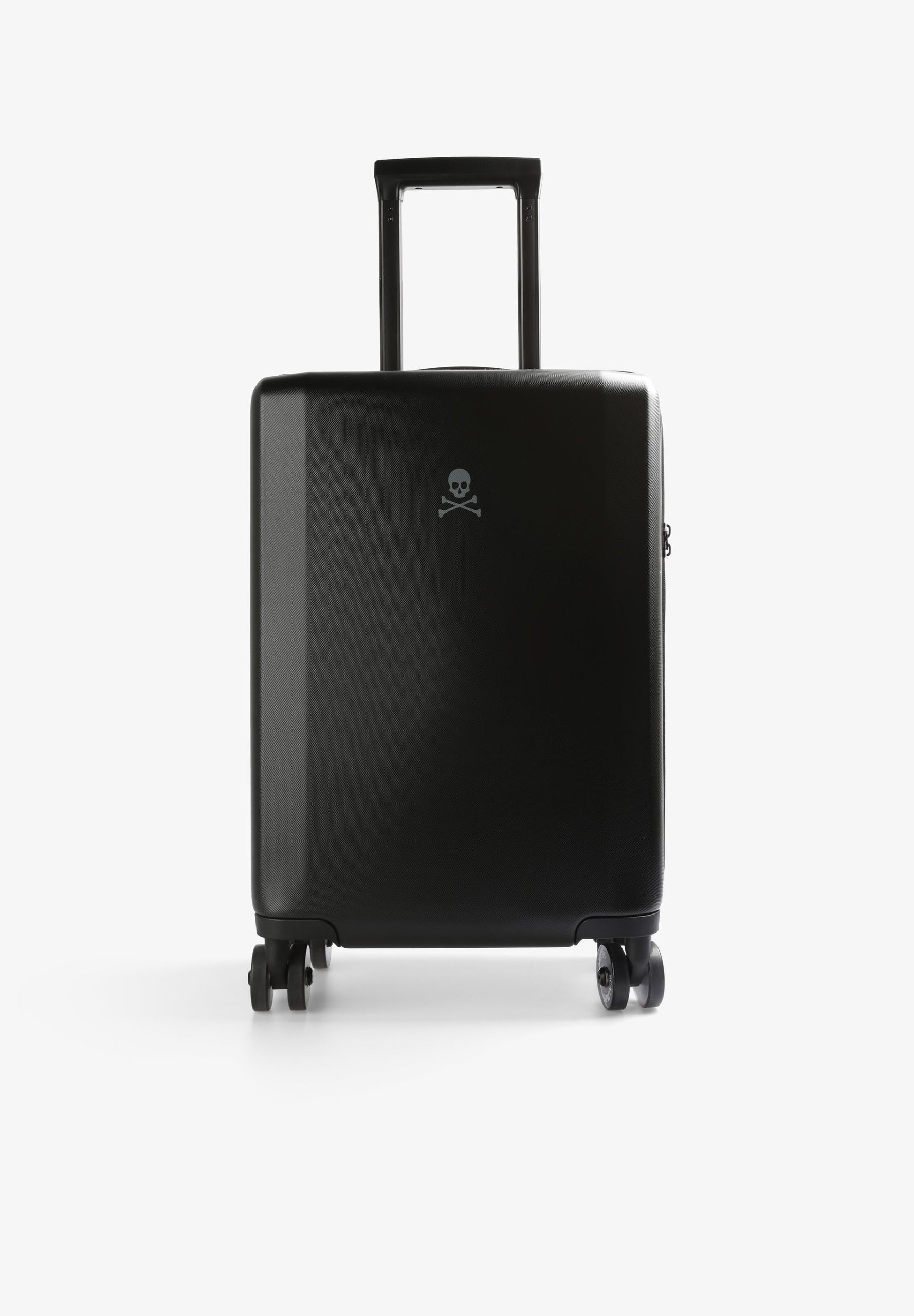 Maleta tipo trolley confeccionada en tejido rígido. Cierre con cremallera y contraseña numérica. Compartimentos interiores con cremallera y ruedas de giro completo. Asa ajustable y asa corta. Detalle de calavera.